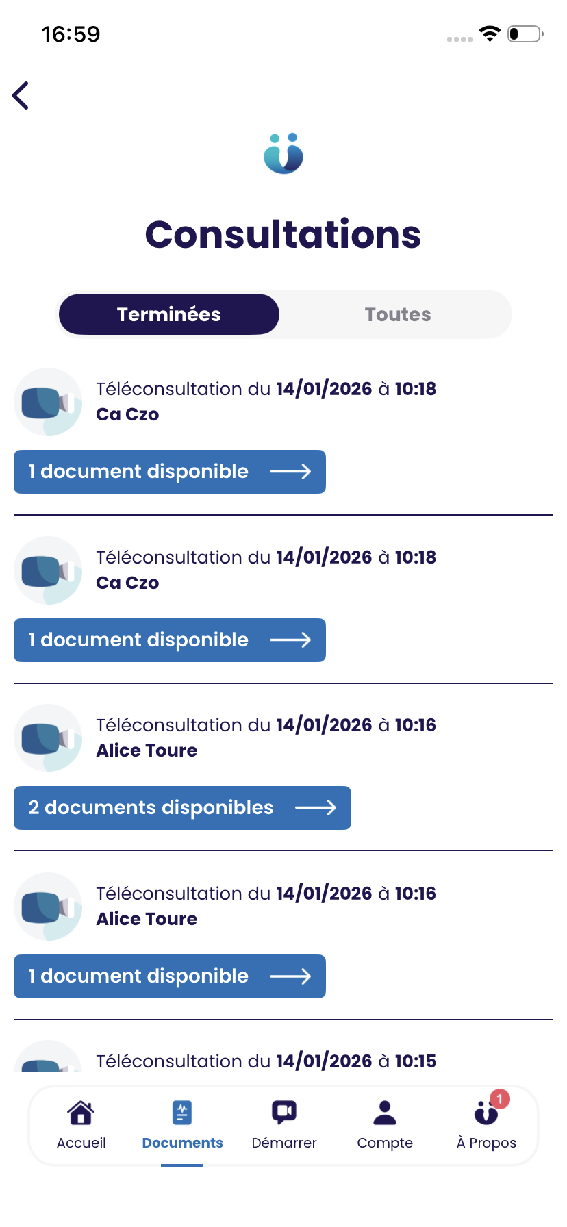 Rendez-vous sur la section Documents puis sélectionnez la téléconsultation pour laquelle vous souhaitez retrouver les documents médicaux :