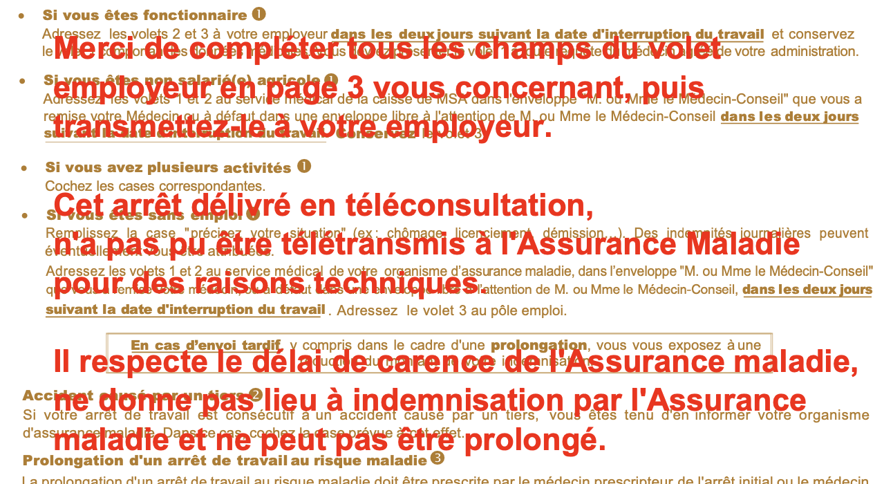 Dans ce cas, un justificatif employeur vous est remis, et seul le volet 3 de celui-ci est à transmettre à l'employeur. Le document transmis ne doit par ailleurs pas être transmis à l'Assurance Maladie et ne donne par lieu à remboursement par l'Assurance Maladie, car dans tous les cas le délai de carence applicable de 3 jours ne permet pas de prétendre à un quelconque remboursement par l'Assurance Maladie. L'arrêt ne peut alors pas non plus être prolongé.