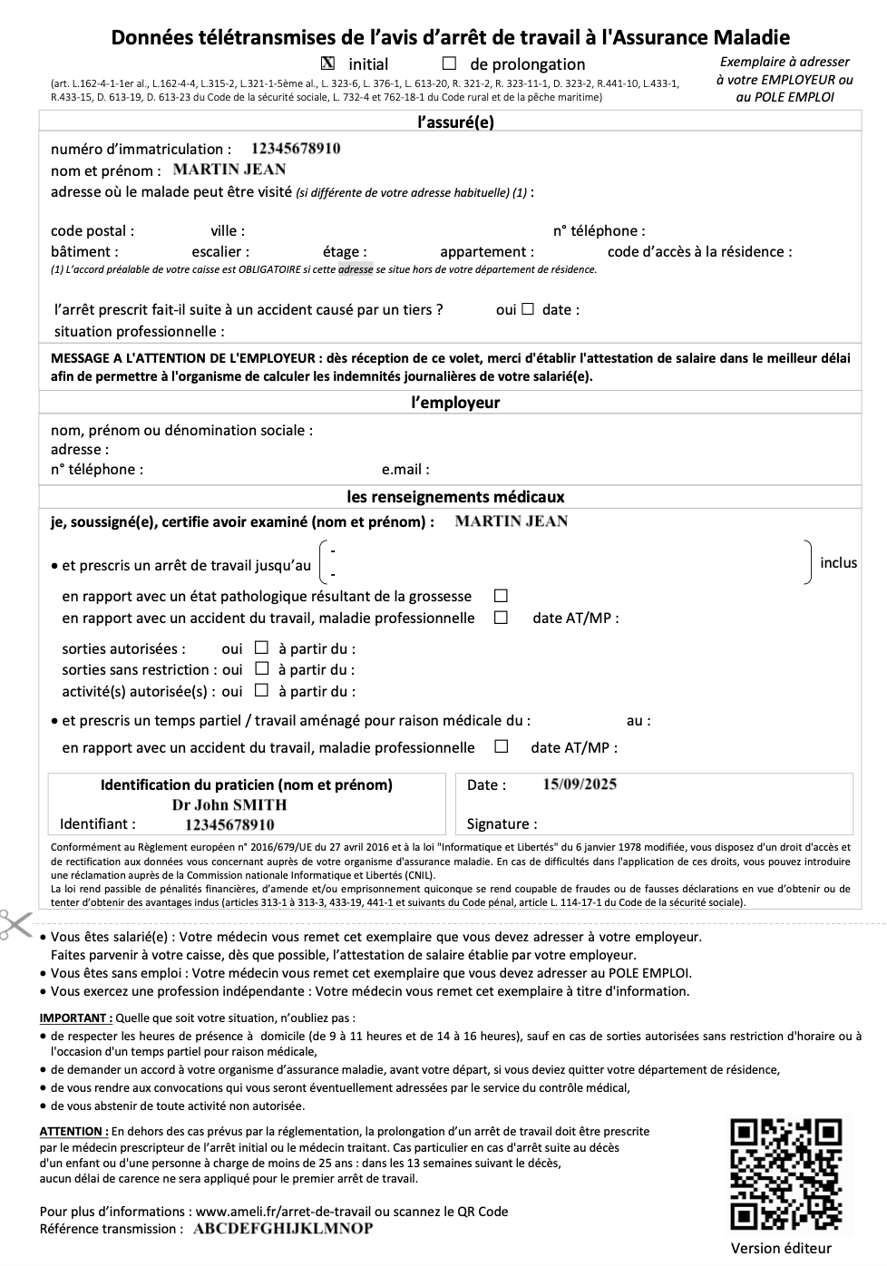 Dans le cas d'un arrêt télétransmis par le médecin, le document est directement transmis par le médecin à l'Assurance Maladie, et comporte des références de télétransmission (visibles en bas à gauche du document) :